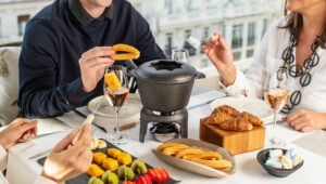 Menú Fondue de Chocolate: Fondue de chocolate Valrhona 70% Con: Variedad de fruta de temporada,…
